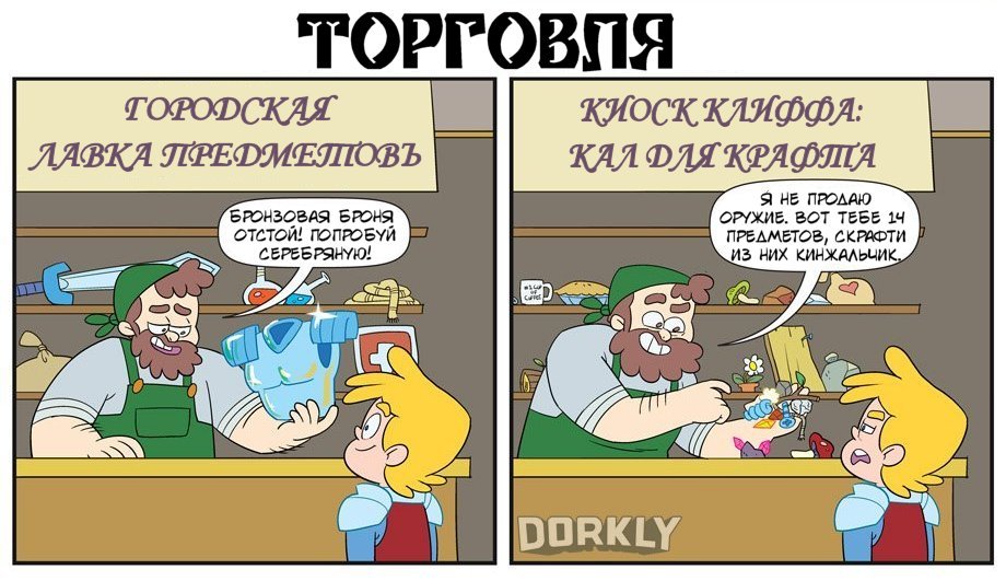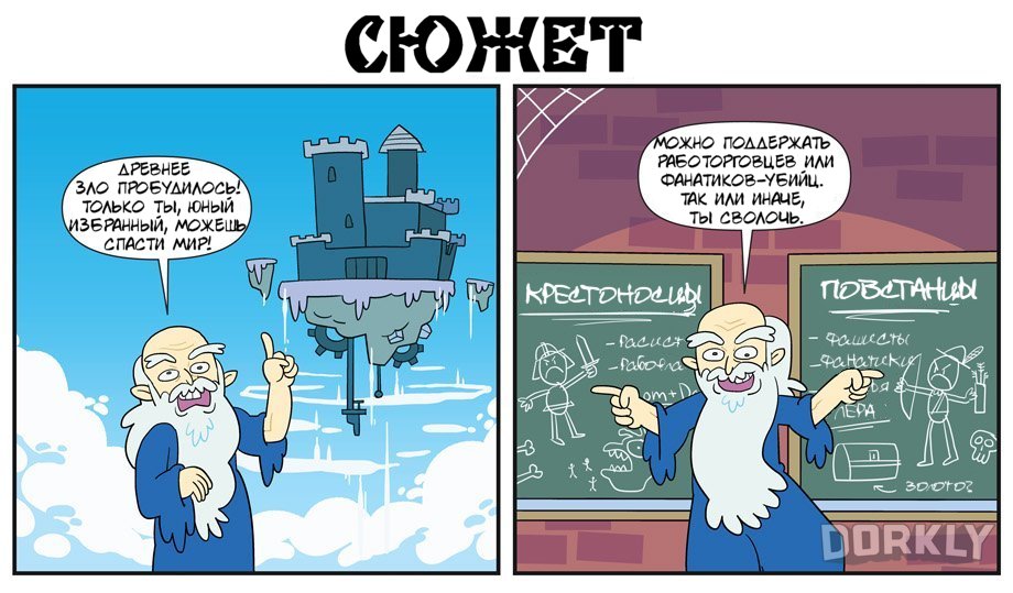 Как изменились ролевые игры со старых добрых времён? Когда-то мы просто спасали мир, а не выбирали меньшее из двух зол, копались в множестве диалоговых опций и знать не знали страшного слова «крафт»... Комикс от Dorkly сравнивает RPG тогда (слева) и сейчас (справа). Перевод Mirf.ru.