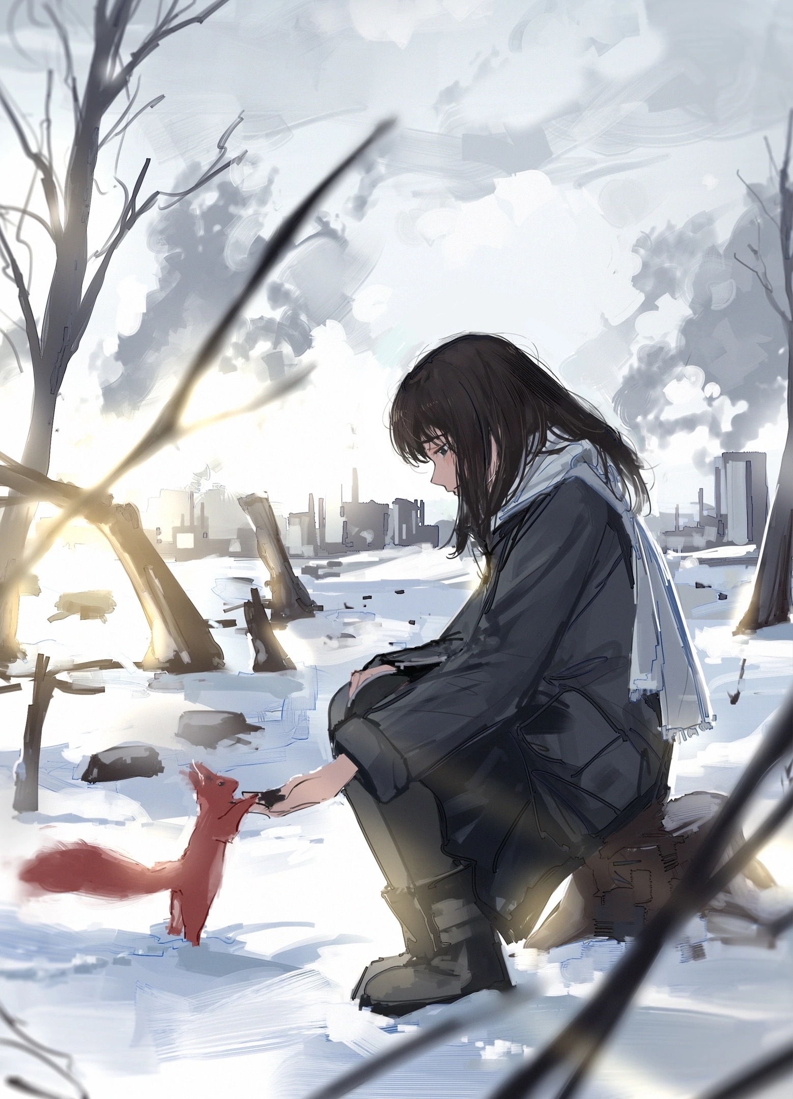 Работа передает ощущение грусти и одиночества, но также надежды и тепла. Чтобы добавить сцене символизма, я сделал свет пробивающимся сквозь серые облака.