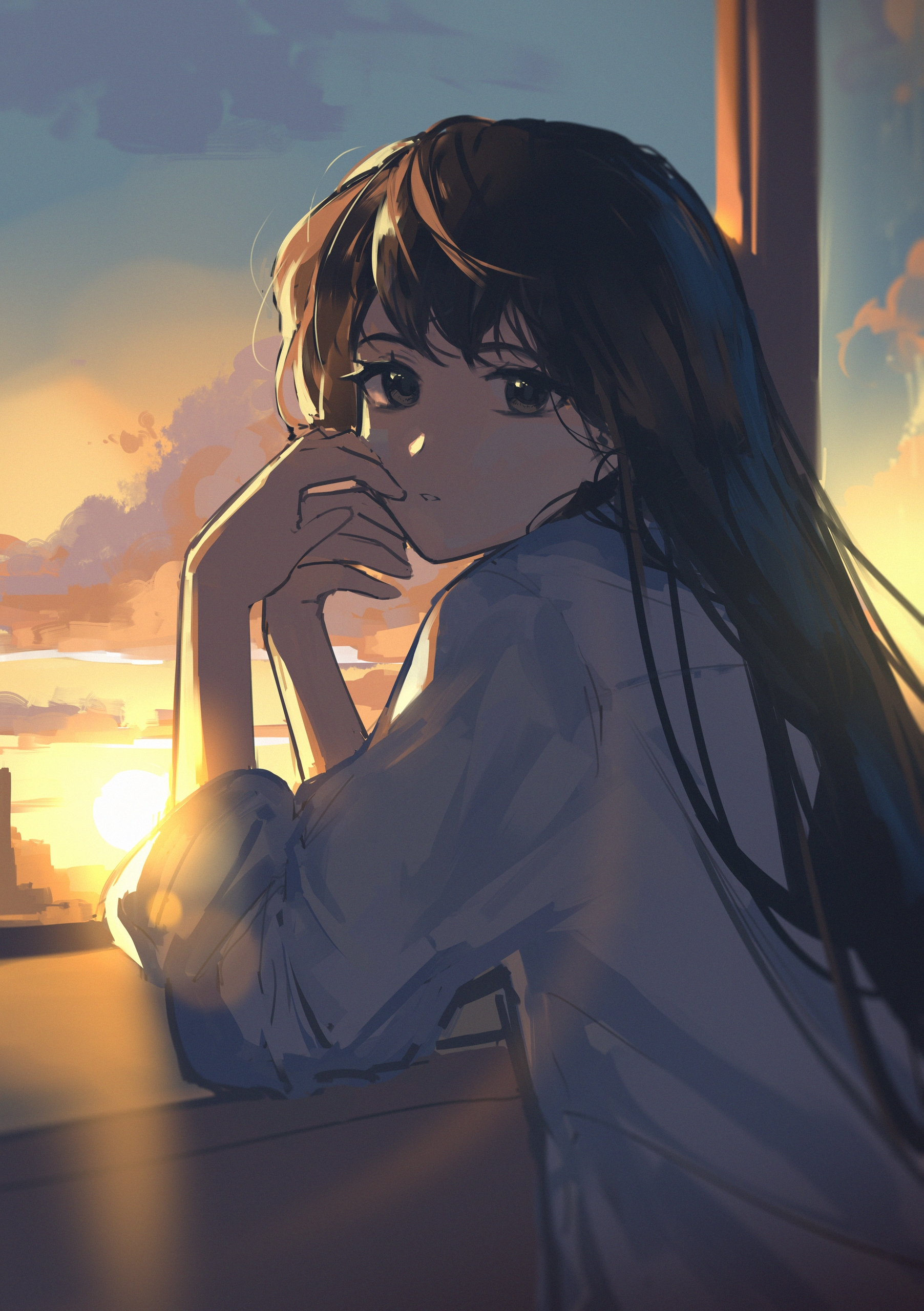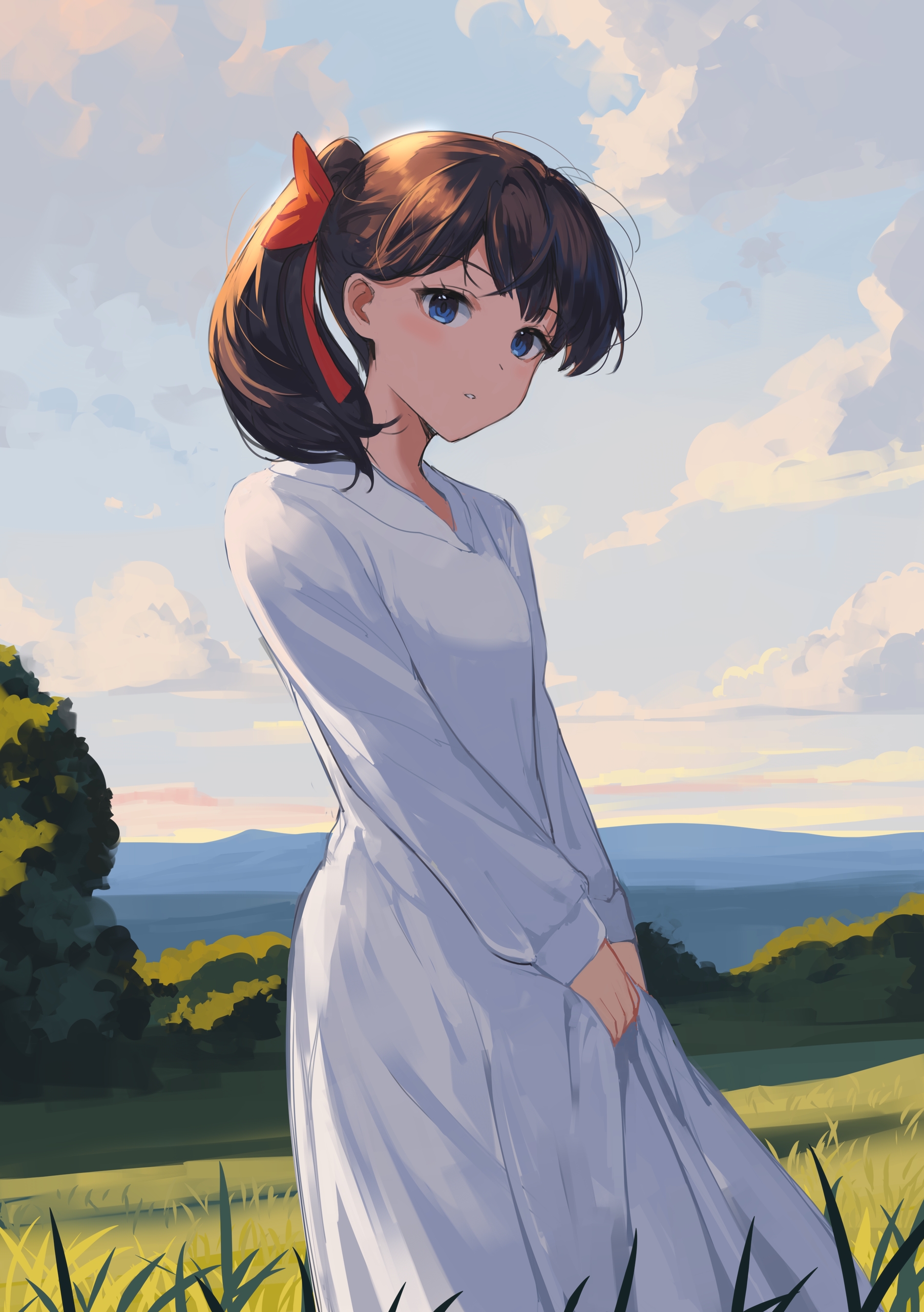В этой работе я хотел передать ощущение спокойствия и нежности. Девушка в белом платье, стоящая на фоне горизонта, выглядит задумчивой и мечтательной. Тёплые цвета неба и природы создают атмосферу летнего вечера, полного безмятежности и света.