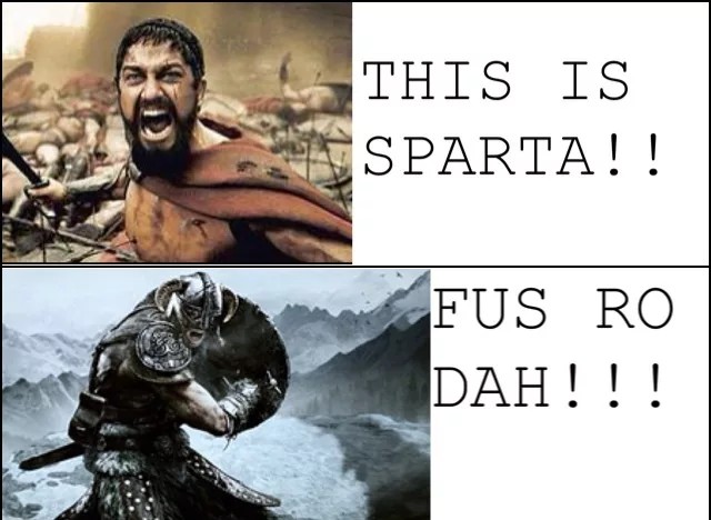 Ещё один некогда популярный мем по Skyrim — крик Драконорождённого «FUS RO DAH», от которого в стороны разлетаются драугры (местная нежить) и даже драконы. Куда его только не лепили — даже на картинки с Михаилом Шуфутинским и «третьим сентября». Сейчас про мем потихоньку забывают, однако после релиза игры от него было не спрятаться.