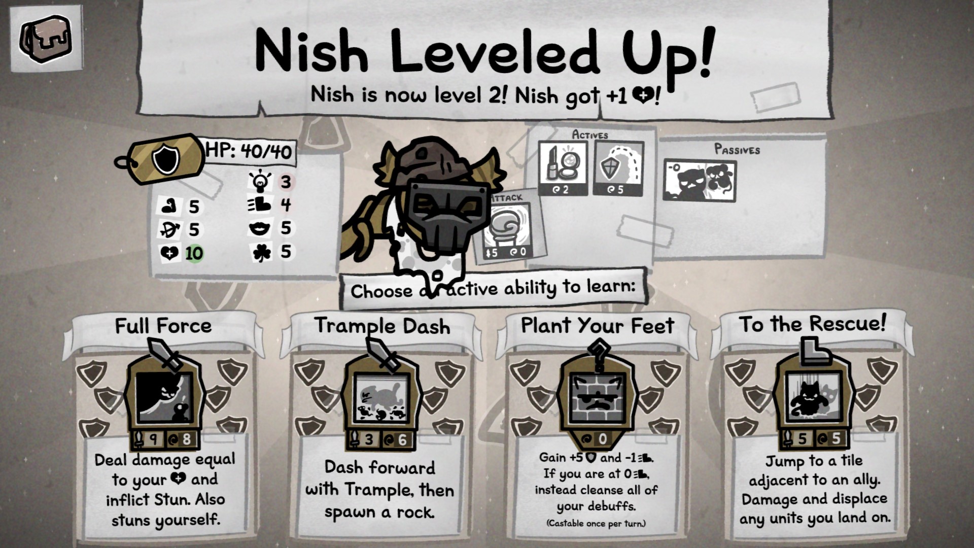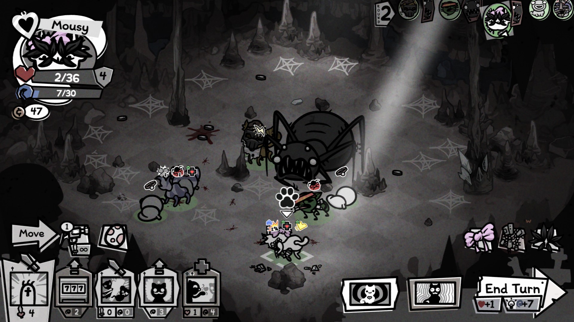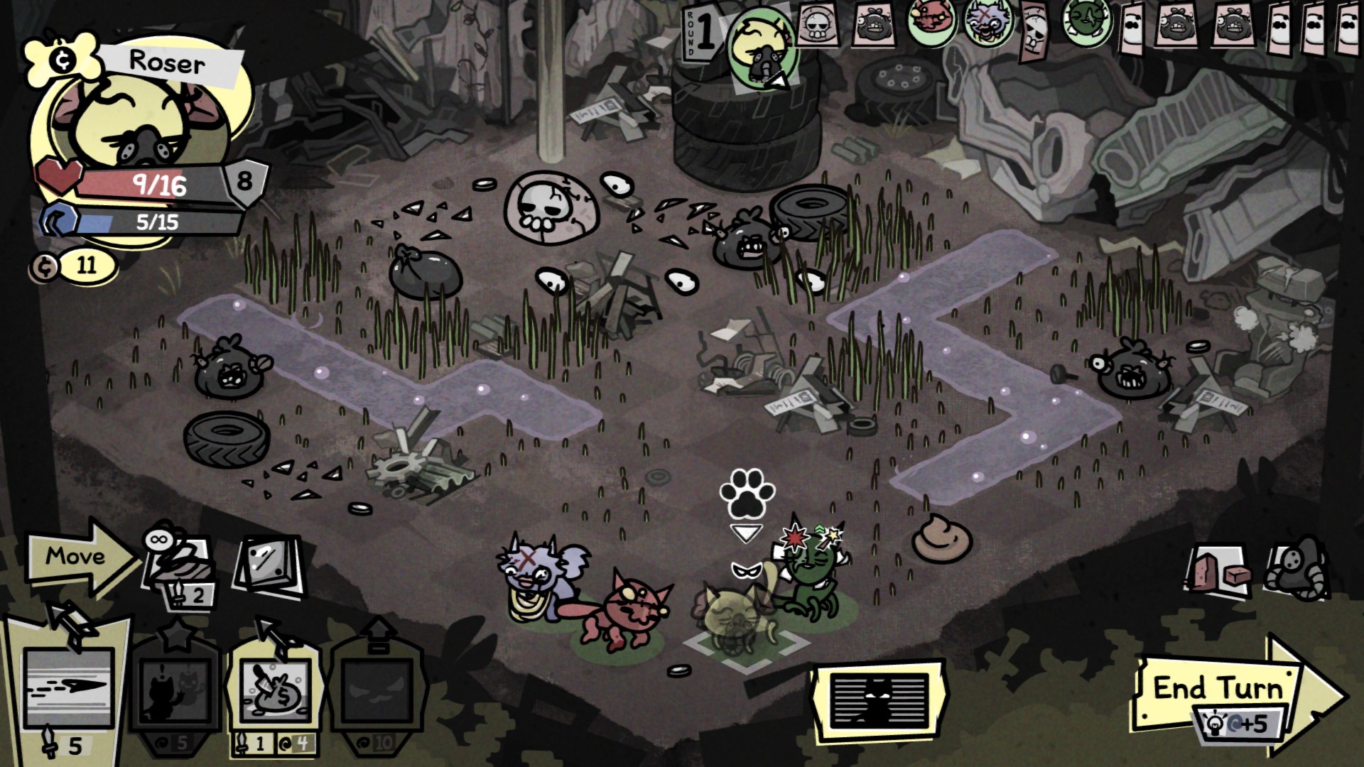 В лучших традициях «Айзека» много за что тут придётся расплачиваться кошачьим здоровьем. Бойцы будут получать ранения и дебаффы, а вреда от некоторых атак тут чуть ли не больше, чем пользы. Например, одна из моих кошек умудрилась заполучить постоянную пассивку «безумие». Из-за этого после первого же хода она каждый раз впадала в неистовство, начинала атаковать всех подряд, носиться по полю, есть всё что попадётся под лапу — в общем, вести себя как почётная городская сумасшедшая.