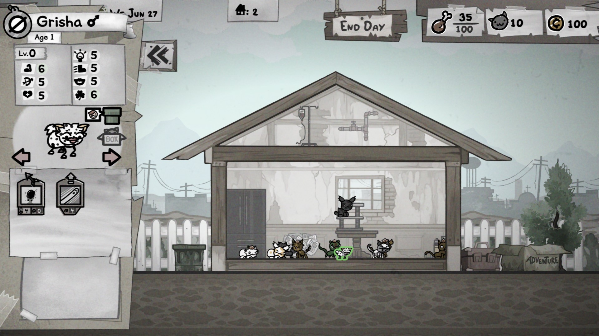 Начинается всё безобидно. После интро и обучения в ваше распоряжение предоставляют неказистый домишко с ободранными стенами и стопкой газет и предлагают организовать там кошачий приют. Котиков, которые мёрзнут на улице, нужно перетаскивать внутрь, а потом регулярно кормить и обустраивать их жилище. Все предметы быта — шкафы, полки, когтеточки и капельницы — влияют на уровень комфорта и здоровья питомцев. Сытые и довольные котики охотнее размножаются — после того как они устраивают успешный тет-а-тет, на свет появляются один-два котёнка, которые в случайных комбинациях наследуют внешность и характеристики родителей. Какое значение имеют характеристики, спросите вы? О, тут-то и начинается самое интересное.