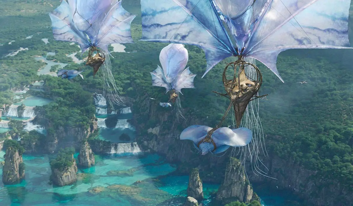 Погружению в мир Кэмерон уделяет немало внимания. «Пламя и пепел» разгоняется не сразу, первая сцена сражения (зато сразу одна из лучших) — почти через полчаса от начала. Когда-то я ругал за подобное «Мятежную луну», но разница в том, что у Снайдера мы любовались на колхоз, а здесь с ходу — виражи на крылатых ящерах, летучие горы, подводный мир, встреча с духом в загробном мире! Пожалуй, самыми запоминающимися вышли торговцы ветра, которые бороздят небеса на медузах-дирижаблях, запряжённых летающими тварями.