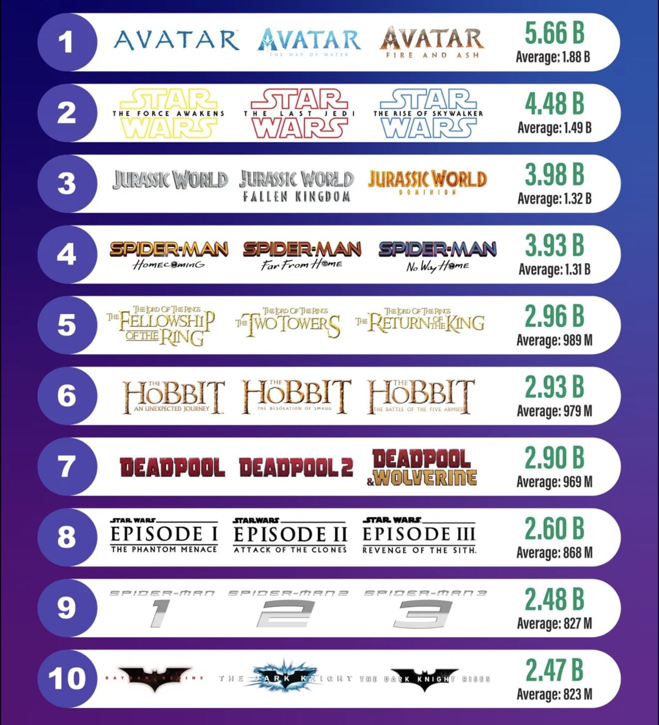 Вторую строчку занимает новая трилогия «Звёздных войн». ($4,48 млрд), а тройку лидеров закрывает трилогия «Мира Юрского периода» ($3,98 млрд). В первую десятку также входят «Человек-паук» ($3,93 млрд) с Томом Холландом, «Властелин колец» (2,96 млрд) и «Хоббит» ($2б93 млрд).