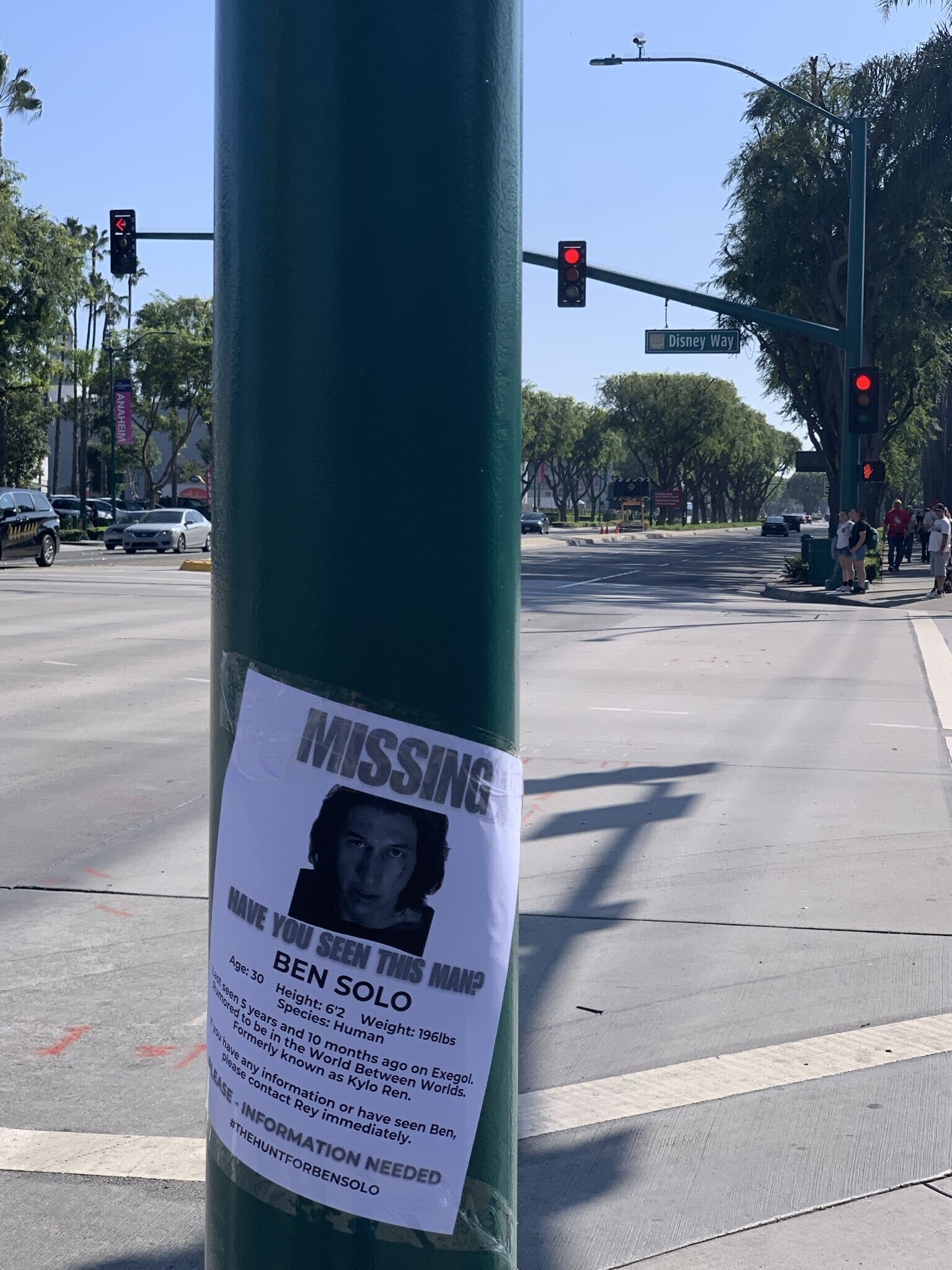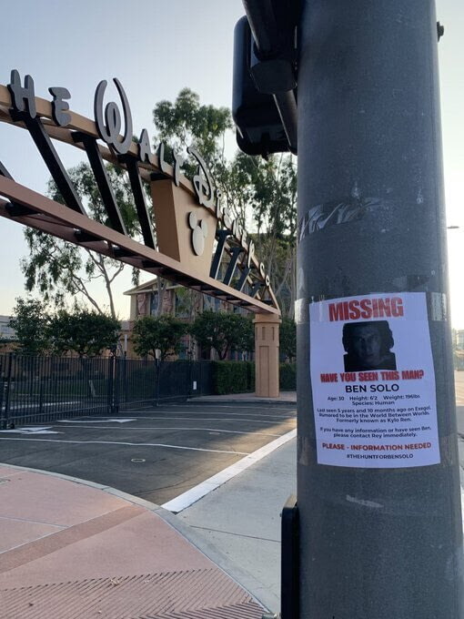 Теперь же перед тем же офисом Disney и Диснейлендом в Анахайме появились вывески о пропаже Бена Соло.
